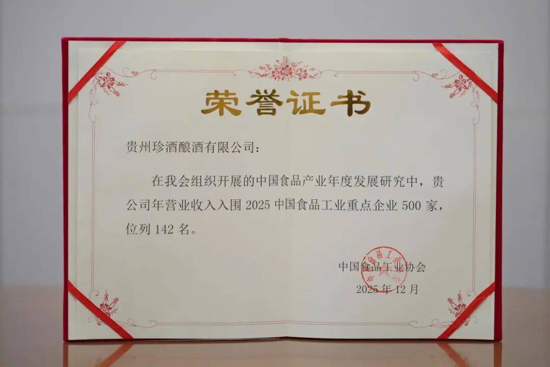 12月24日至26日,第二十三届中国食物平安大会暨2025全国食物工业科技前进大会正在举行。会上,中国食物工业协会发布了“2025中国食物工业沉点企业500家”名录,贵州珍酒位列142位。“贵州珍酒大曲特征特征阐发及财产使用”项目荣获中国食物工业协会科学手艺二等。
