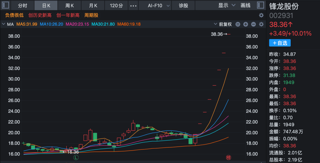 此前,2025年12月16日晚间,嘉美包拆(002969。SZ)通知布告,姑苏逐越鸿智科技成长合股企业(无限合股)(以下简称“逐越鸿智”)拟通过和谈收购、要约收购体例收购嘉美包拆54。90%股份,买卖总对价约22。82亿元。自动静发布起,嘉美包拆股价大涨230%。持续7个买卖日涨停后,锋龙股份(002931)于1月6日披露股票买卖非常波动通知布告称,如将来公司股票价钱进一步非常上涨,公司可能申请停牌核查。目前公司股价已严沉偏离上市公司根基面,将来存正在快速下跌的风险。