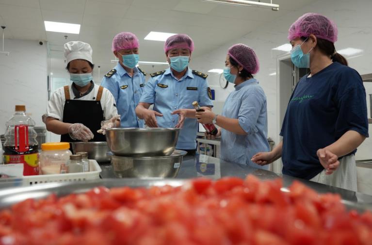 正在檢查過程中,執法人員深切食堂后廚,嚴格查驗米面糧油、生鮮蔬菜等大食材的進貨憑証及質檢報告,確保來源可逃溯﹔核查食物儲存條件能否達標,針對部门學校存正在的設備清潔不徹底等問題,執法人員現場指導整改。